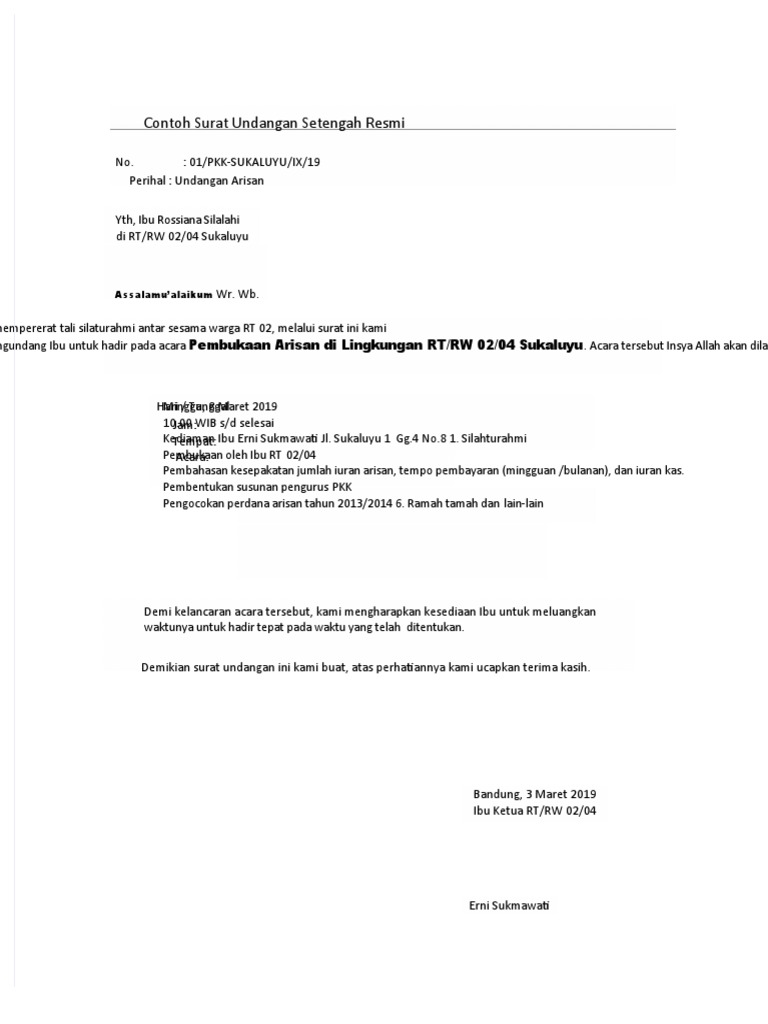 Savesave contoh surat undangan setengah resmi for later. Namun pada perjumpaan sebelumnya, yang mana kami juga telah menyampaikan materi tentang biodata diri. Sehingga seakan penulisannya setengah miring atau setengah lurus. Contoh surat undangan setengah resmi yaitu. Mohon maaf apabila banyak kesalahan dalam. Contoh surat setengah resmi yang bisa ditemui dengan mudah adalah surat lamaran kerja, surat permohonan, surat orang tua kepada sekolah, dan sebagainya. Pemahaman menulis surat undangan resmi perlu dilakukan agar surat yang dibuat bisa sesuai dengan tata cara yang benar. Isi surat undangan bisa jadi untuk surat resmi maupun tidak resmi. Sedang mencari format surat undangan setengah resmi yang baik dan benar? Undangan resmi mungkin bukan sesuatu yang akan anda kirimkan setiap hari. Ketika kita mengirim informasi surat resmi dengan cara tulis tangan dan bahasa yang sopan, maka kita akan terlihat lebih profesional dalam suatu hubungan. Disini surat undangan resmi merupakan surat undangan yang dikeluarkan oleh pihak organisasi yang biasanya ditunjukan kepada organisasi lain atau perseorangan. Berikut kami berikan contoh surat undangan resmi yang bisa dijadikan referensi dalam pembuatannya.