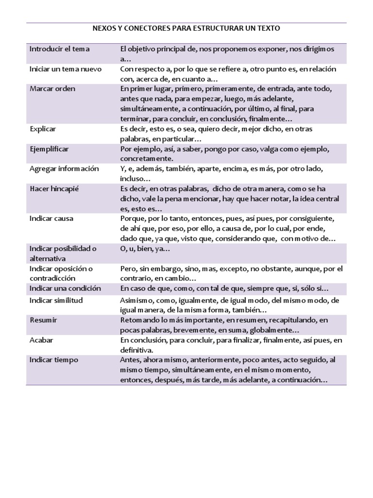 Los nexos son, en gramática, todas aquellas palabras que se utilizan para enlazar palabras u los nexos tienen la particularidad de que carecen de significado por si mismos y son palabras invariables. Carta a la hija de un fascista. Nexos y conectores para estructurar un texto introducir el tema iniciar un tema nuevo marcar orden explicar ejemplificar agregar información hacer hincapié. Enviado por dipa68 • 7 de mayo de 2013 • 238 palabras (1 páginas) • 3.235 visitas. Los nexos son palabras o conjunto de palabras que sirven para unir o conectar palabras u oraciones con otras.